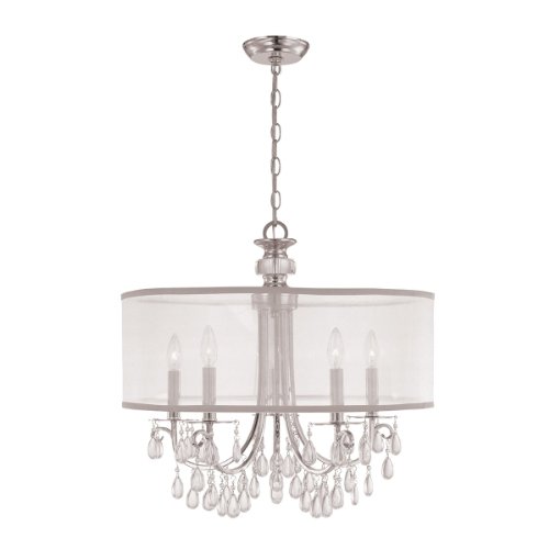 Finish:Polished Chrome, Shade:Silver Silk Shimmer, Light Bulb:(5)60w B10 Cand C Incand Hampton Five-Light Chandelier Stylish, modern and minimal chandelier features a custom made translucent shade crafted from high quality silk fabric in gold shimmer This contemporary design has extra sparkle with amber, smooth crystal jewels draped from themetal frame