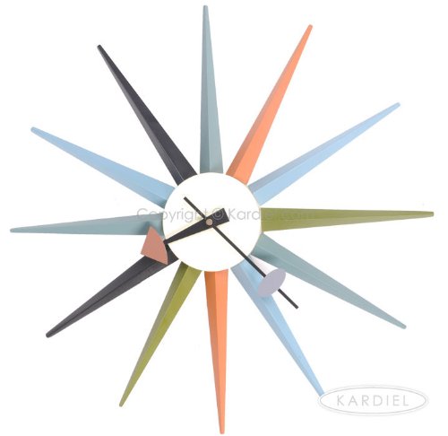 The Sunburst Clock multicolor is widely considered to be one of George Nelson's most beloved design creations. George Nelson is the recognized pioneer of modern wall timepiece designs. Nelson created over 150 iconic clocks and the Sunburst multicolor clock is the most recognized of his works. Nelson used pure color and bold yet whimsically modern shapes in his wall clocks. The Iconic Sunburst design displays these classic modern design traits beautifully. If your goal is to create a "Modern" space, this clock is an affordable focal point to build upon. Compare the details anywhere. Kardiel offers the highest quality architecturally accurate reproduction of Nelson's Sunburst clock updated with modern quartz timekeeping.