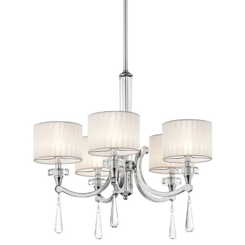 Kichler Quality Since 1938, Cleveland-based Kichler Lighting has been known for their innovative designs and excellent craftsmanship. Kichler is the world's leading decorative lighting fixture company and the winner of four ARTS Lighting Manufacturer of the Year awards. Kichler designers travel the world to discover the latest trends in exterior and interior style, colors, and designs. They then translate the best of those trends into fixtures that will bring beauty, pleasure, and light into your home. Kichler fixtures stand the test of time and are functional works of art that you're sure to treasure. Elegant crystal accents. Chrome finish with organza fabric shades. 5 lights. Requires five 60-watt candelabra bulbs (not included). Overall dimensions: 26W x 24.5H inches.