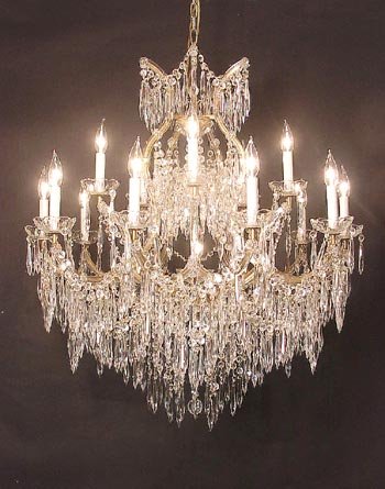 Maria Theresa 100% Crystal Chandelier. A Great European Tradition. Nothing is quite as elegant as the fine crystal chandeliers that gave sparkle to brilliant evenings at palaces and manor houses across Europe. This exquisite version from the Maria Theresa collection is decorated with various 100% crystal that capture and reflect the light of the candle bulbs, each resting in a scalloped bobache. The timeless elegance of this chandelier is sure to lend a special atmosphere in every home Please note this item requires assembly. This item comes with 18 inches of chain. 16 Lights HT 36 WD 36.