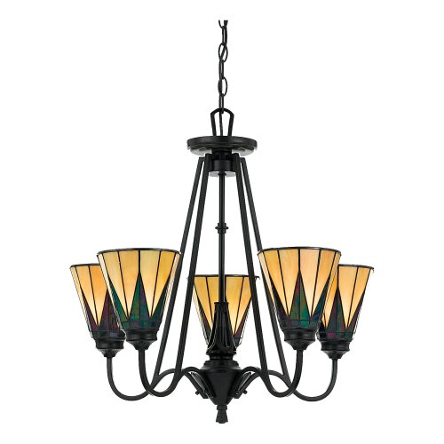 Tiffany-Stained Glass Single Tier Chandelier in Valiant Bronze with Tiffany glass from the Gotham Collection by Quoizel. Dimensions: 25 H 25 W